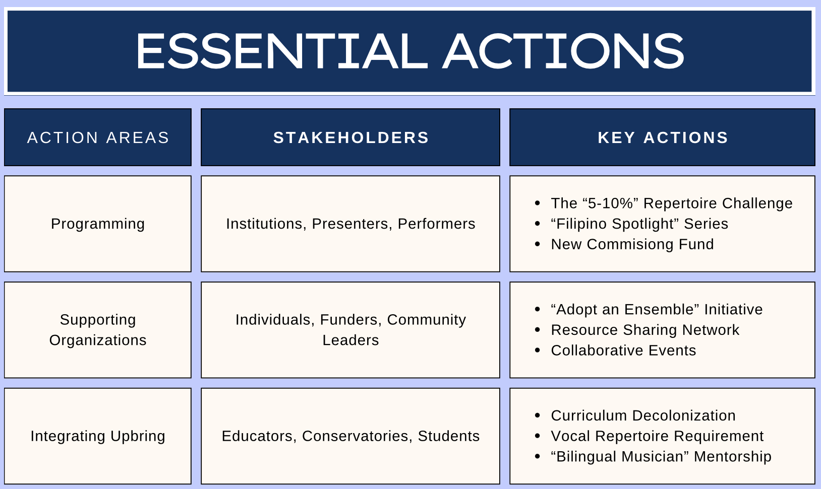 - “Bilingual Musician” Mentorship: This establishes mentorship programs to help students reconcile and integrate their Filipino musical training with Western conservatory standards.